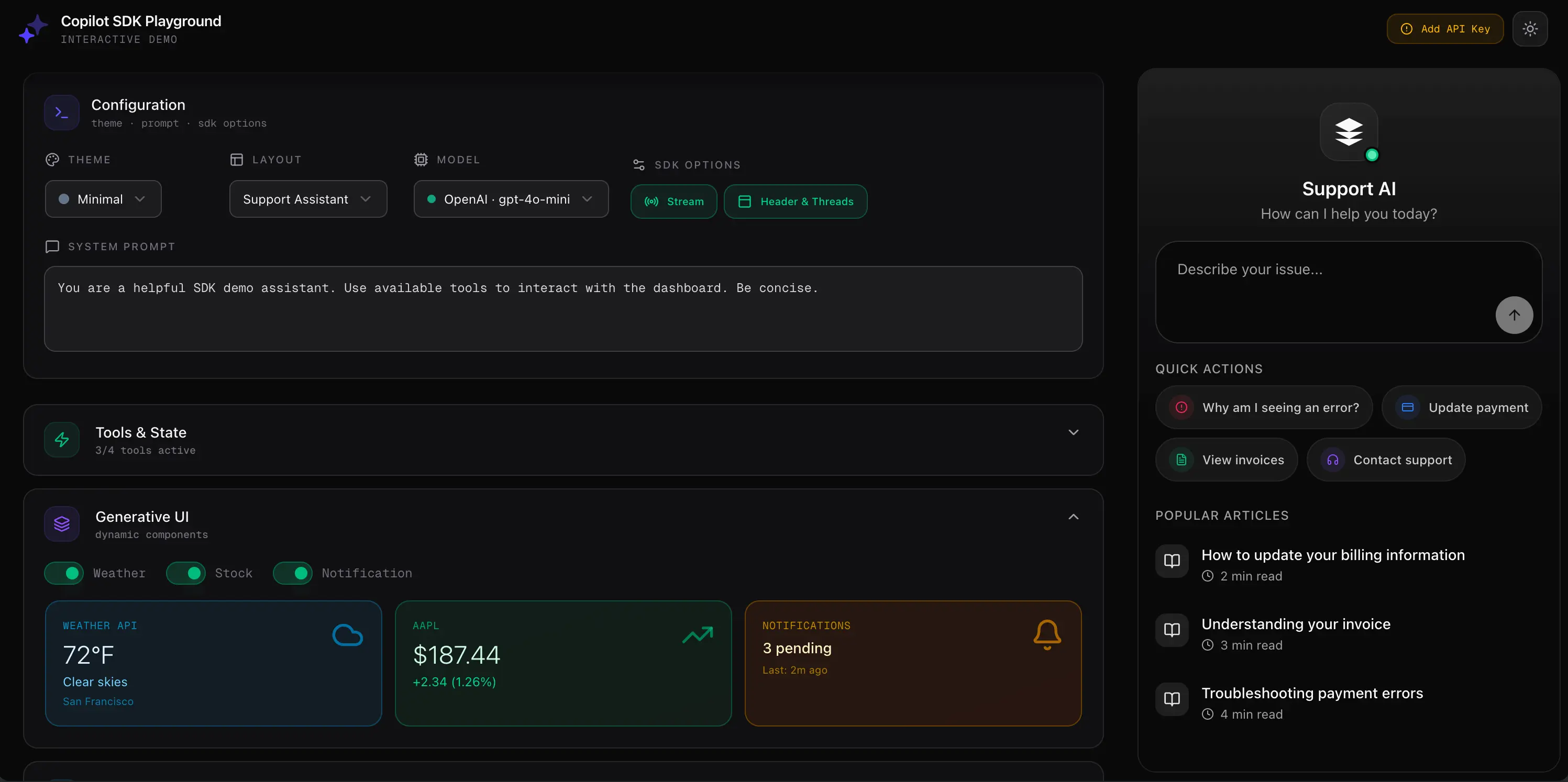PlaygroundInteractive sandbox to experiment with Copilot SDK featuresCopy MarkdownOpenCopilot PlaygroundTest Copilot SDK with multiple providers, configure tools, and explore features in an interactive environment.Try PlaygroundView on GitHubMulti-ProviderStreamingToolsGenerative UIThemesExamplesReal-world Copilot SDK implementationsOverviewWhat is Copilot SDK